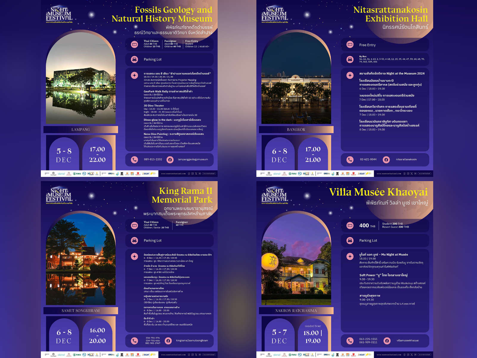 Также в этом фестивале примут участие Мемориальный парк Короля Рамы II в провинции Самут Сонкрам (6-8 декабря, 16:00 - 20:00) и Музей на Вилле в Каояй, пров. Након Ратчасима (5-7 декабря, экскурсии в 18:00 и 19:00, для гостей курорта скидка 25%).
