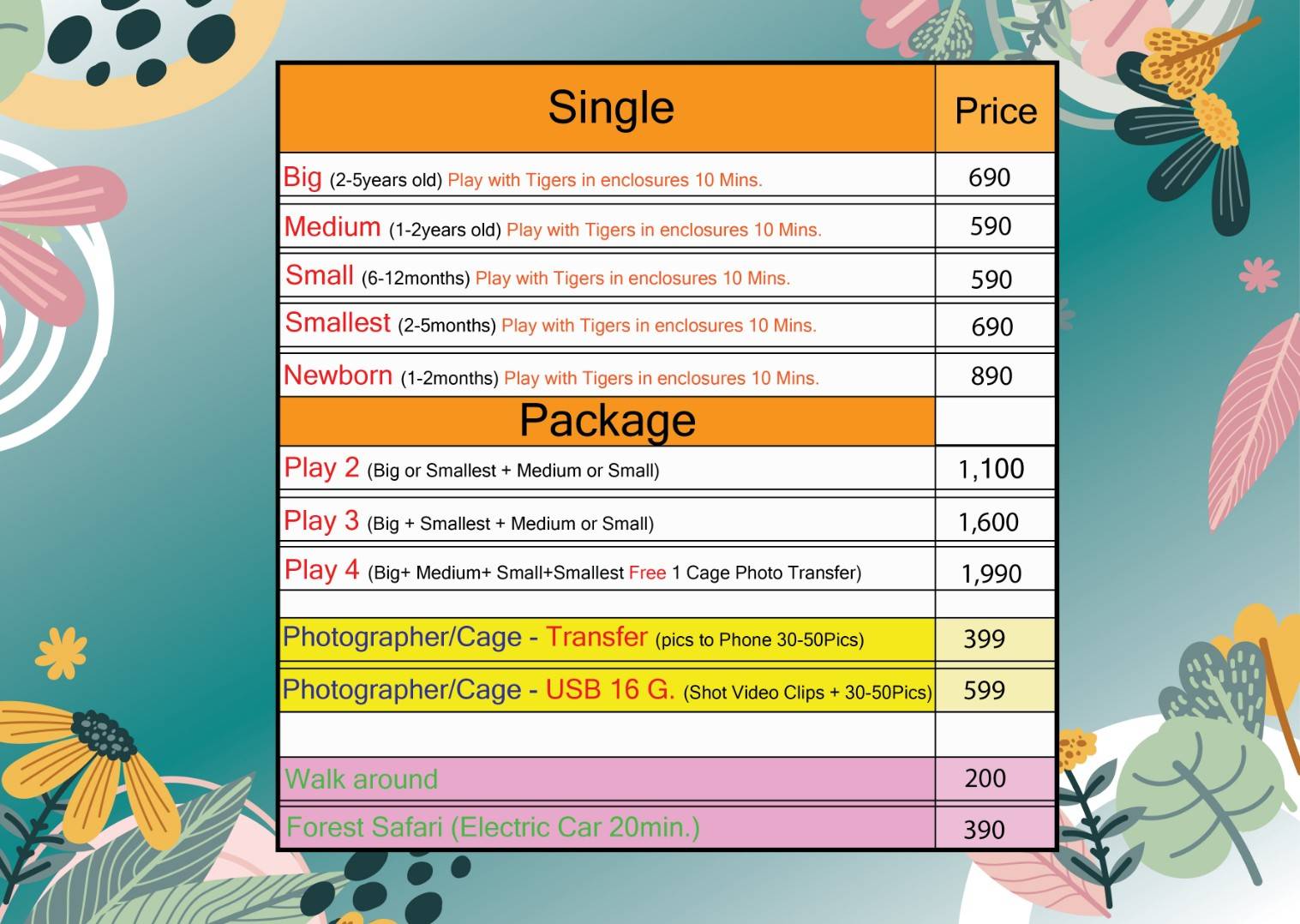 • Новорожденные тигры (1 месяц): 1 090 бат.